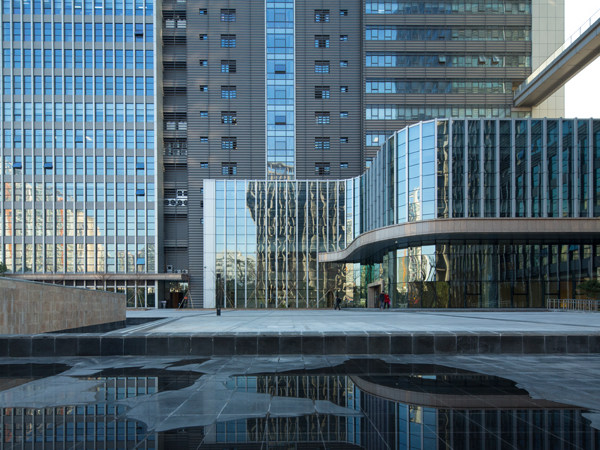 整体布局以点式和板式结合,北座为主要办公空间,布置在基地西北部;南座为辅,布置在基地东南部。两座错位布置,使大部分的办公空间均有良好的视野和通风条件,并与北区现有建筑一起围合出空旷的广场绿化空间。