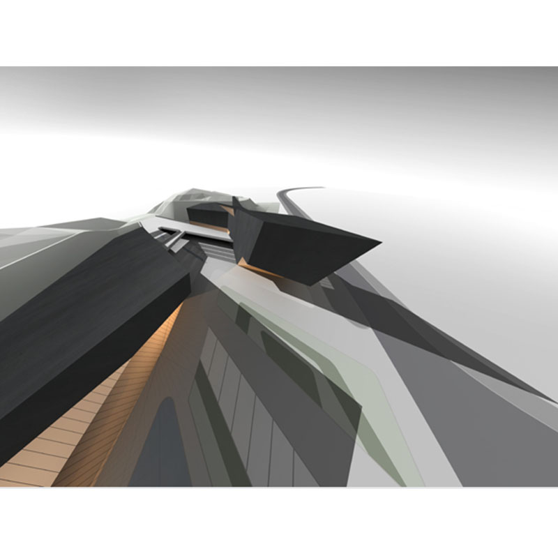 本案由基地外西北边的两个山包延伸出来两部分顺势形成美术馆和交易中心;而山凹顺延下来,形成了入口前广场及上山的台阶。美术馆部分则把原有的古村落包围起来,重新融合成建筑的一部分,可谓顺势而为,宛若天成。建筑形体简练利落,以山形为道,犹如用刻刀与山体凿出而成,厚重大方,透出传统的金石味,拙补中隐约透出版画性格。本案利用基地内几条关键的控制线(古村落,道路)作为统领建筑的基本坐标,建筑空间形态就此法而生,形成一个自由独特又不失理智性规矩的建筑。顺延基地内两个山包生长出来的主体建筑自然形成两个“实体”形态,而山凹向下延伸部分则形成了实体间的“虚空间”,虚实相生,阴阳协于一。
